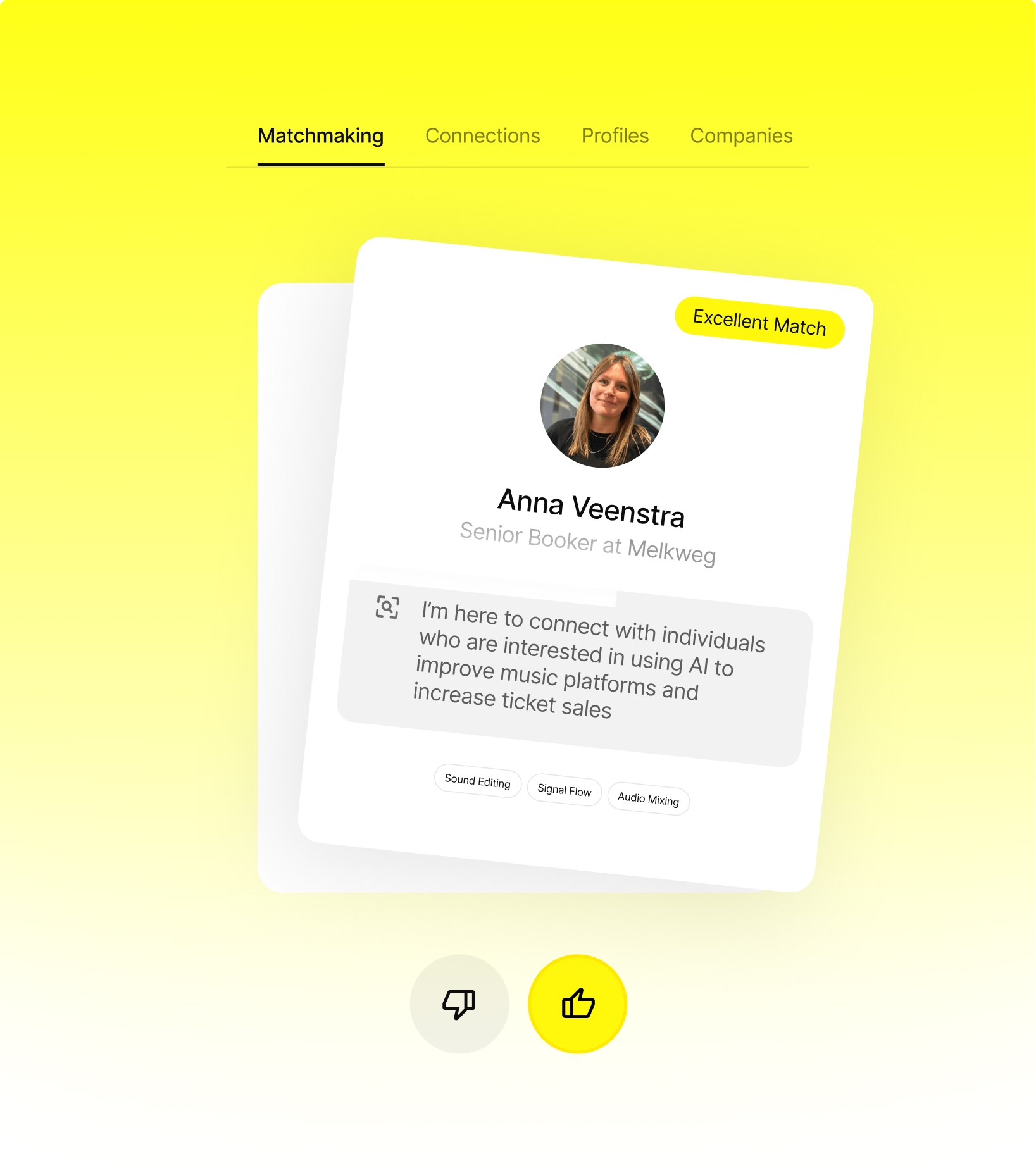 Using data, AI, and user insights, we designed features that adapt to individual needs. Smart profiles and matchmaking support professional networking, while personalised recommendations and a For You feed help visitors discover events, artists, and sessions that match their interests.